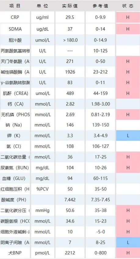 初步检查证实了刘医生的担忧:壮壮不仅口腔散发尿毒症特有的氨臭味,还伴有皮肤非薄、腹部膨大、呼吸急促等复杂症状。病情的难点在于,患犬高龄、再生能力差,且长期缺乏体检,病史不明。更严峻的挑战在于,初步诊断揭示出肾衰、胰腺炎、心衰、肝功能不全和库欣氏综合征等多种危重疾病并存,这些疾病在治疗上往往相互矛盾——例如,纠正肾衰需要充分补液,而这又会加重本就脆弱的心脏的负荷。