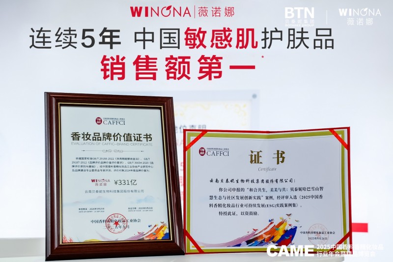 今年8月,经权威机构沙利文认证,薇诺娜已连续五年(2020-2024)在中国敏感肌护肤品销售额第一,这不仅体现了消费者的高度认可,也印证了品牌经历多年深耕积累的专业壁垒。此次大会中,贝泰妮集团在可持续发展及品牌价值建设领域再获加冕,斩获三项权威认证:贝泰妮集团荣获「2025中国香料香精化妆品行业可持续发展(ESG)实践案例集」证书,薇诺娜荣获2024年度「香妆品牌价值证书」,并入选“2025化妆品品牌50强”。
