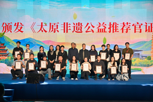 与会领导为采风团的媒体、达人颁发《太原非遗公益推荐官证书》,“太原非遗公益推荐官”们将用他们的创意和影响力,为太原非遗宣传代言。