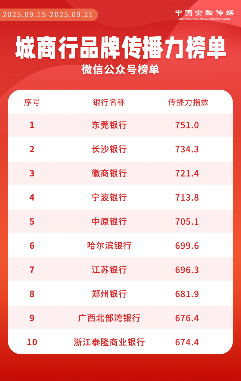 本期微信公众号传播力榜单中,东莞银行表现出众,凭借 751.0 的传播力指数登顶榜首。其累计发布 3 次共 17 篇文章,借助业务公告类内容,在信息触达上具备明显优势。长沙银行以 734.3 的传播力指数紧随其后,发布 2 次 14 篇文章,其招聘内容精准覆盖招聘需求群体,总阅读数近 8 万次,展现出对目标受众较强的吸引力;徽商银行以 721.4 的传播力指数跻身前三,单篇最大阅读数达 4.4万,依托纪念币热点切实提升传播声量。上榜银行或聚焦服务通告、招聘需求,或借助热点福利内容,通过契合公众号传播逻辑的差异化策略,有效提升品牌传播力,充分体现出城商行公众号内容运营的多元路径。