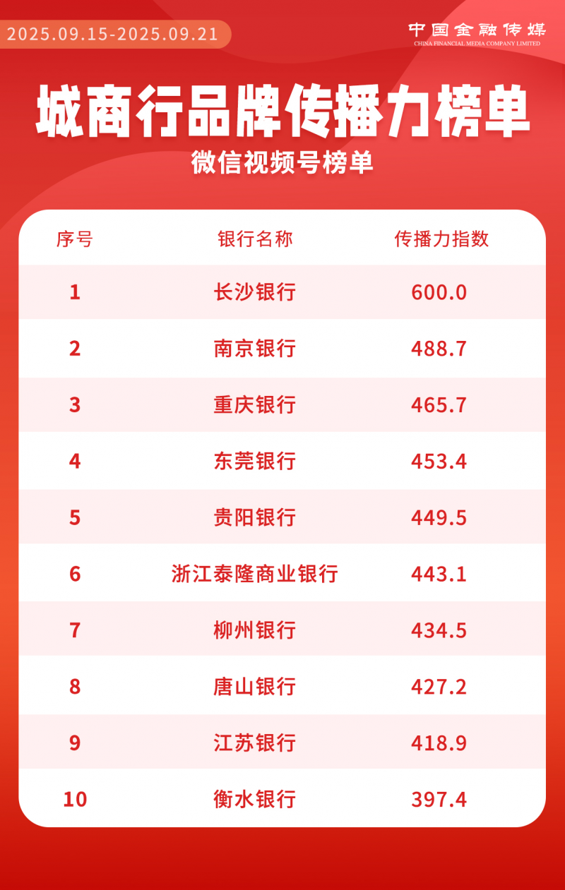 本期城商行视频号传播力榜单中,长沙银行以 600.0 的传播力指数呈现断崖式领先态势,通过维护金融权益、反诈科普类内容传递品牌责任;南京银行以 488.7 的传播力指数位居第二,2 条作品聚焦 “金陵十二时辰” 创新内容,借助城市文化与产品结合的方式吸引目光;重庆银行以 465.7 的传播力指数位列第三,4条作品聚焦金融教育宣传周输出科普类内容。三者以差异化内容策略提升传播力,展现出城商行视频号多元化的运营路径。