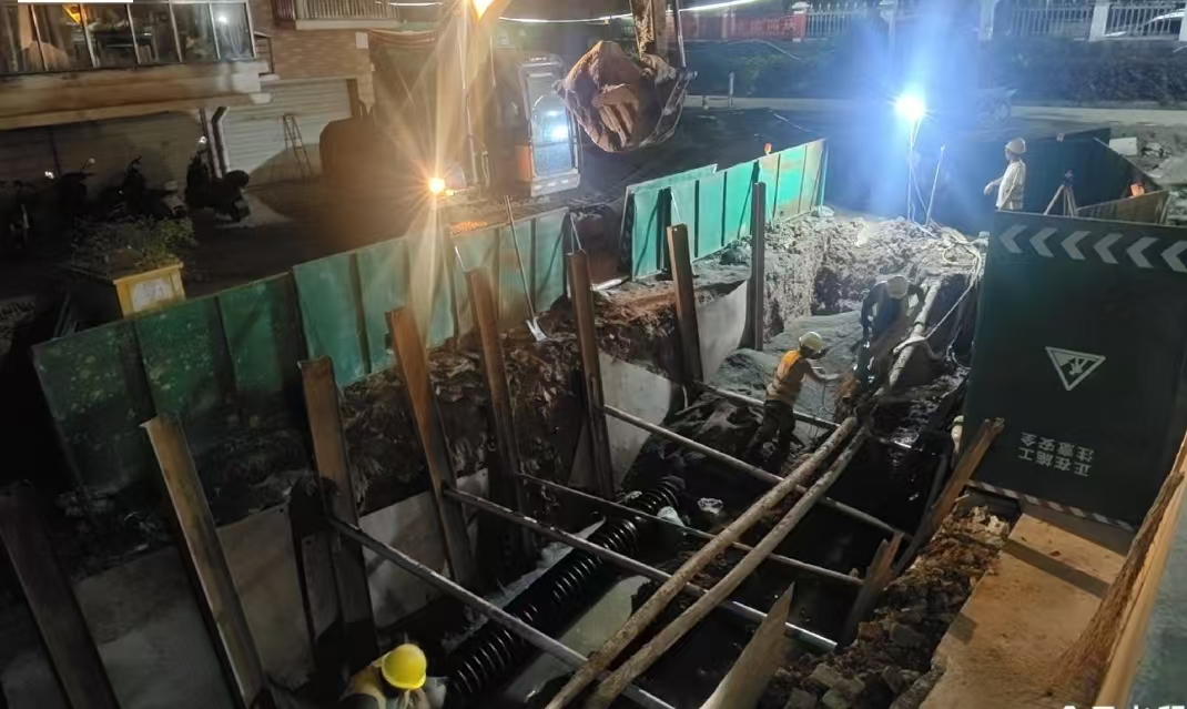 来自五湖四海的工人们分布在各个作业面,柯师傅的话道出了大家的心声:“谁不想回家陪老人孩子?但项目工期紧,多干一点,工程就能早一天完工,居民就能早一天享受新环境。”10 月 1 日晚8点,一栋北侧污水管道安装作业仍在有序推进;运输车辆在施工便道上来回穿梭,确保物料供应不断档,全力保障施工节奏。