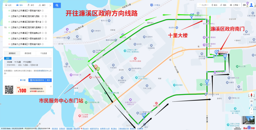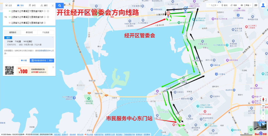 往返路线走向:祥和路东侧(九龙新城A区)——八里湖大道——柴桑路——渊明大道(柴桑区行政服务中心)。车辆停靠沿线公交站点。详见下图: