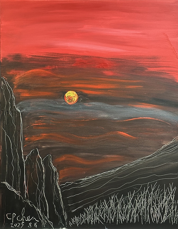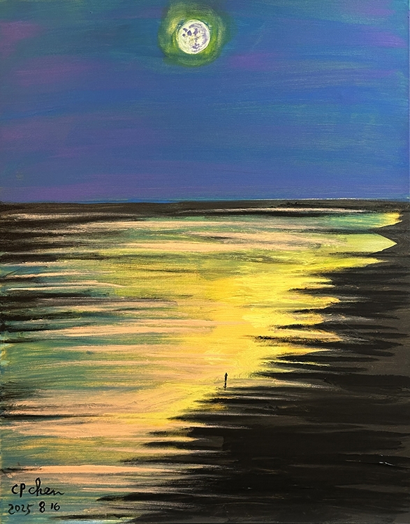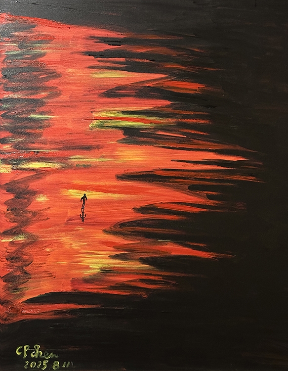 例如陈持平的《我在未来寻找你》系列,以“未来”“记忆”与“过去”交织呈现。画面中的海浪并不汹涌激烈,而是以平静之态泛起层层涟漪。落日余晖洒落海面,灿烂辉煌,正如“天水共长天一色”的诗意境界。画中既有夕阳西沉,也有月色清辉,其间轻轻点出一个行走于浪潮与滩涂交界的人影。在观众看来,这一系列实则更像是他对自我生命与时间维度的深沉诠释。