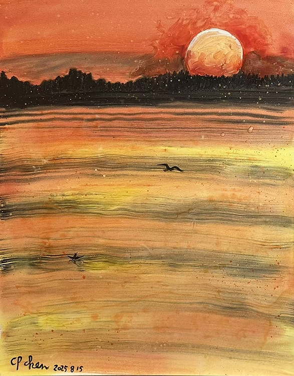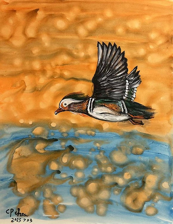 从作品来看,陈持平虽选择丙烯这一现代媒介,却并未丢失作为艺术家的传统精神底蕴。他的许多题材仍深深植根于中国古典美学,如鸳鸯、荷花等典型意象,皆透露出浓厚的东方意蕴。而在风景题材创作中,如海边、山水等,陈持平则展现出极为大胆的用色风格。他不吝于宣泄色彩,常以浓郁饱和之色构建情境,赋予画面强烈的视觉张力与开放的情感氛围。他在丙烯艺术上的成功,正得益于对个人道路的坚定选择——让思想与创作实践并行,以文人思潮为引领,以丙烯颜料为媒介,从而在画布上建立起一个自洽而深厚的美学体系。