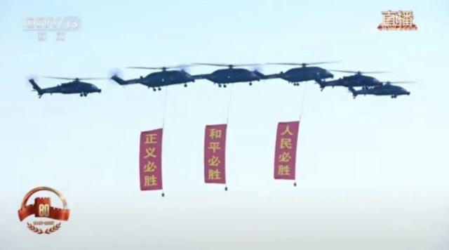 9月3日,纪念中国人民抗日战争暨世界反法西斯战争胜利80周年阅兵仪式庄严举行。45架直升机组成的空中护旗梯队飞越天安门广场上空,其中6架直-10武装直升机护卫党旗、国旗、军旗,3架直-8L运输直升机悬挂“正义必胜”“和平必胜”“人民必胜”条幅,让无数人热泪盈眶,这9架直升机均由景德镇直升机厂所研制。
