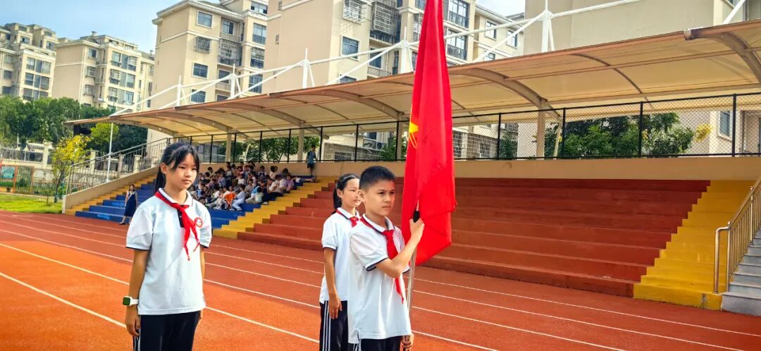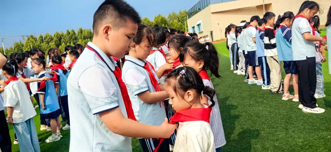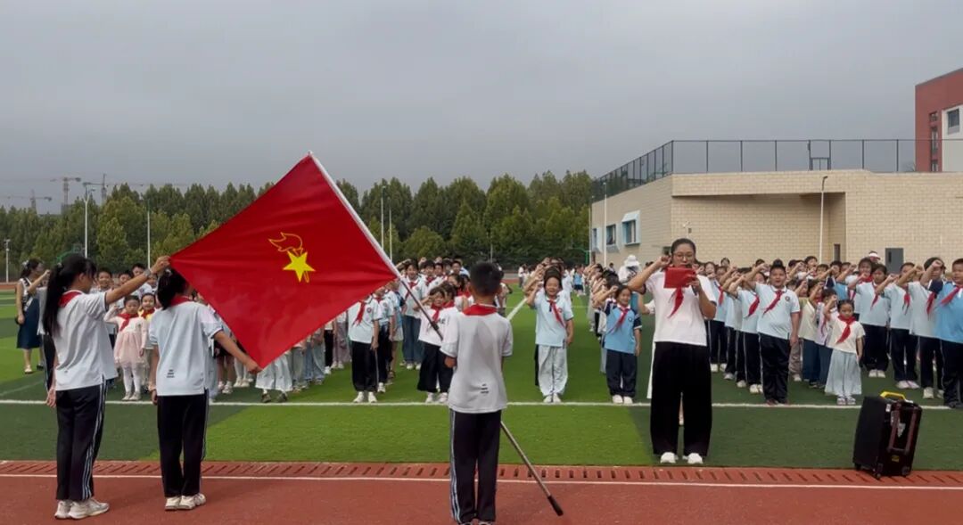 活动现场,队旗飘扬、气氛庄重。在出旗、合唱队歌后,学校大队部宣布杨景荣等90名同学光荣加入少先队。随后,老队员为新队员佩戴红领巾,新老队员互敬队礼;全体新队员面向队旗宣誓,老队员重温誓词,铮铮誓言彰显少年担当。