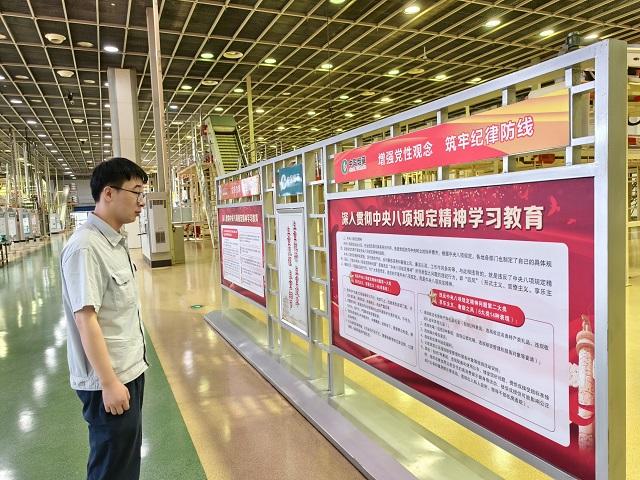 井冈山卷烟厂职工正在观看深入贯彻中央八项规定精神学习教育宣传展板