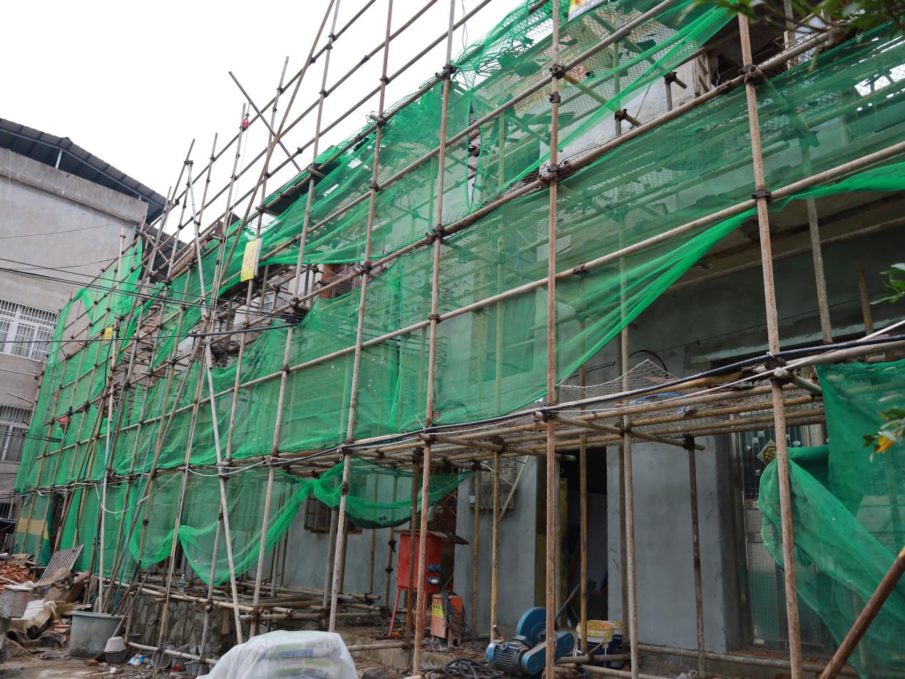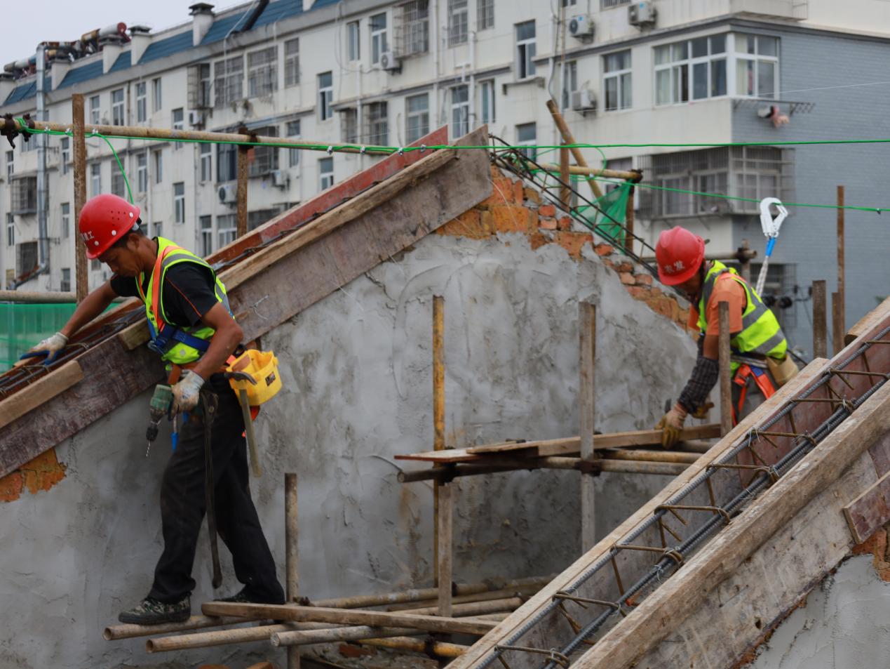在人民北路71号改造现场,施工如火如荼。目前,外墙粉刷及抗裂砂浆施工已完成,门窗进入安装阶段,内墙空鼓拆除完毕,主体工程预计11月上旬收尾,市政配套计划12月中旬完工。工人们身着安全装备,在脚手架上有序作业,拆除废弃设施、修补墙体、敷设管线,老旧建筑逐步“脱胎换骨”。