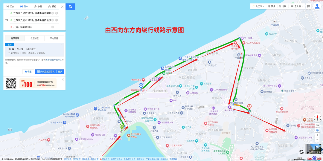 绕行调整后走向:由浔阳路——交通路——滨江路——甘棠北路——浔阳东路。返程方向不变。