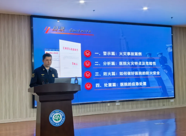 培训会上,张利通过监控录像回放、火场场景复盘等形式,深度剖析医院场所火灾特点、人员疏散难点及事故根源,并结合医院人员密集、设备复杂等特性,重点指出电气线路老化、危化品违规存储、消防通道堵塞等日常巡查中的高频隐患;详细讲解了医院内各类消防器械的规范操作流程,包括灭火器“提、拔、握、压”的正确使用方法、消火栓快速连接水带与水枪的操作要领,以及消防应急照明和疏散指示系统的检查要点;并反复强调“黄金3分钟”初期火灾扑救的关键作用,要求医务人员在发现火情初期珍惜每一秒时间,做好每一次正确的操作。