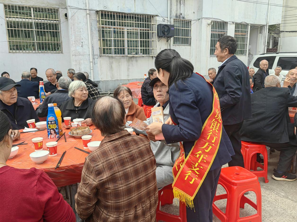 岁岁重阳,今又重阳。10月29日,在这敬老孝亲、登高祈福的传统节日里,万年县小溪村戏台前格外热闹,上饶银行万年支行利用当地村民共聚午餐的时机,组织开展了“情暖夕阳红,防非金融行”主题宣传,把金融知识送到老人身边。