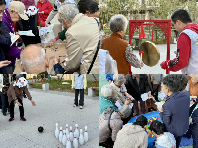 游园会伊始,“神速快手”暖场游戏迅速点燃了现场气氛,纸杯与纸巾的碰撞间,充满开怀的笑声;益智游戏“拼字”环节,大家组队合作,拼凑“寿”“福”“康”等寓意美好的汉字,在娱乐中锻炼了思维能力;“保龄球挑战”吸引了众多长者一试身手,他们在运动中舒活筋骨,交流心得;儿童游乐区里“套大鹅”的欢笑声不绝于耳,门球场内“模拟钓鱼”项目则考验着参与者的耐心与定力。丰富多彩的游戏环节设置,不仅让长者们活动了身体,更让他们在挑战与成功中收获了满满的成就感与愉悦心情。