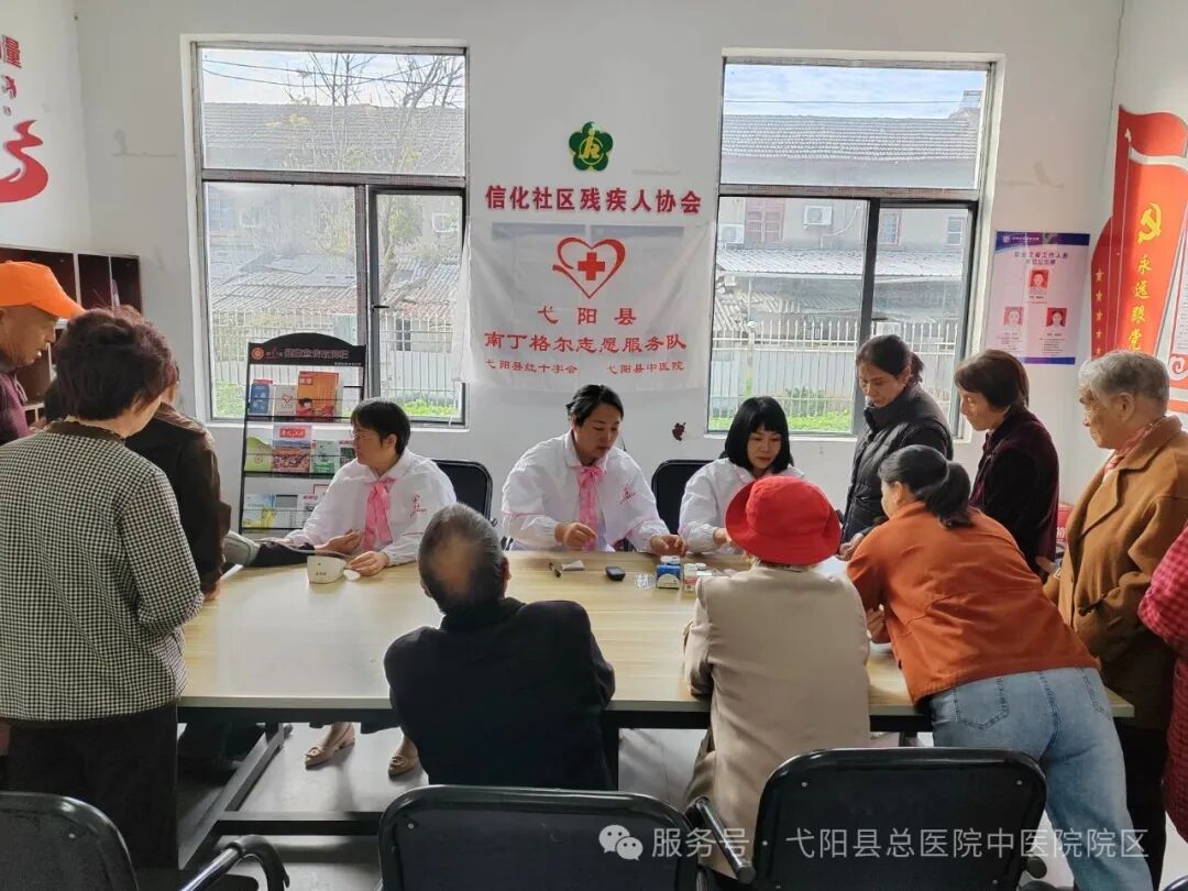 同日,弋阳县红十字会联合中医院南丁格尔志愿服务队,走进桃源街道信化社区开展“弘扬中华美德,关爱老人健康”活动。义诊现场暖意融融,志愿者们为老人测血压、血糖,提供热敏灸、颈肩推拿等中医康复服务,仔细询问病史并给出服药建议,还耐心解答健康咨询,讲解秋冬保健知识,指导老人合理饮食、科学锻炼。