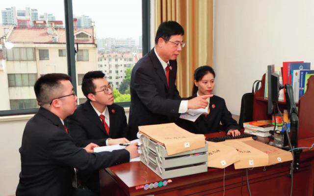 九江市浔阳区人民检察院四级高级检察官饶建斌(区检察院原党组成员、副 检察长,右二)积极发挥“传帮带”作用,指导年轻检察干部办理案件(2025 年 4 月8日摄)姚卫东摄