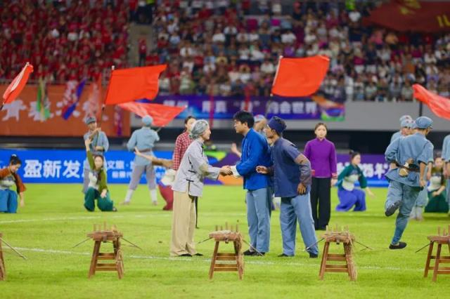 “体育赛场不同于传统舞台,面向如此高密度群体关注的舞台,如何让节目既符合赛事氛围,又不失红色文化庄重感?”经过反复研讨与斟酌,谢慧最终确定了“情景再现+全民合唱”的表现形式:将红色文旅史诗《长征第一渡》中的经典片段——草鞋舞和情景剧《告别》搬上赛场,并选用《十送红军》作为背景音乐。