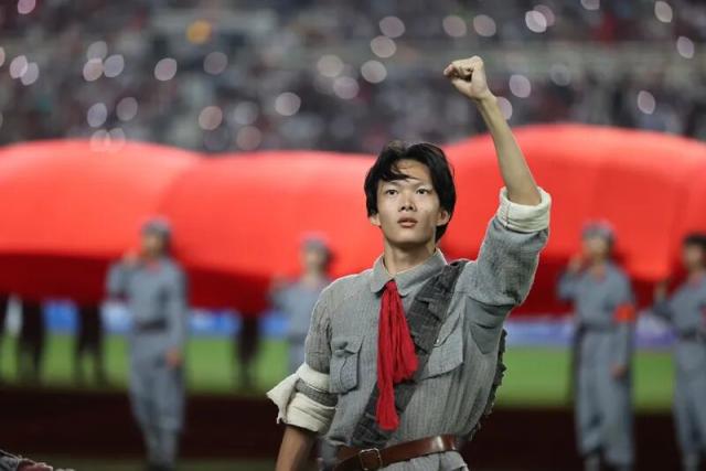 随着跌宕起伏的战斗旋律渐次响起,看台上万人接力传递巨幅红旗,场面气势恢宏、令人热血沸腾。