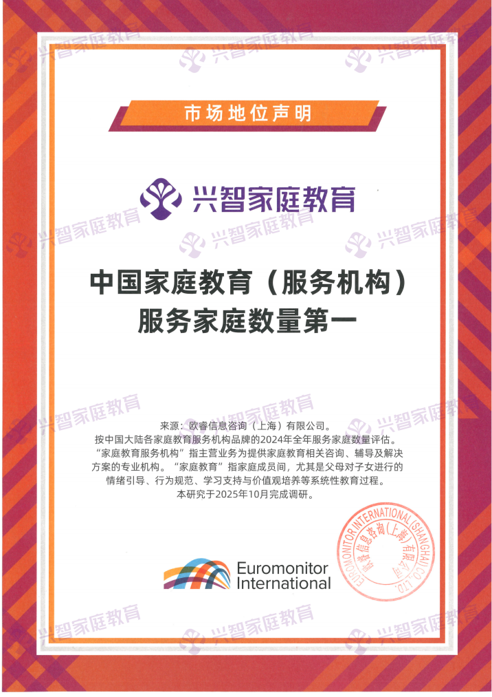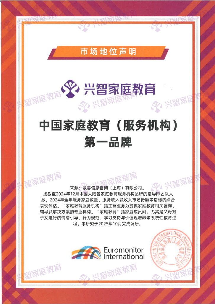 2025年10月,兴智家庭教育经全球领先的独立市场研究机构欧睿国际官方认证为“中国家庭教育(服务机构)第一品牌”、“中国家庭教育(服务机构)服务家庭数量第一”、“中国家庭教育(服务机构)指导师团队人数第一”。