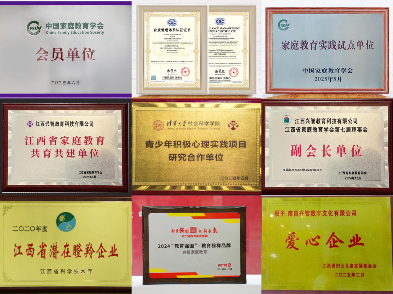 十年来,兴智获得了中国家庭教育学会、江西省家庭教育学会等官方机构的双重认证;与清华大学社会科学学院进行长期深入合作,开展青少年积极心理实践项目研究;构建了覆盖0-18岁孩子及父母成长需求的四大科学课程体系;并始终坚守合规底线,获得中国质量认证中心CQC颁发的合规管理体系认证证书;坚持开展公益行动,持续践行社会责任。