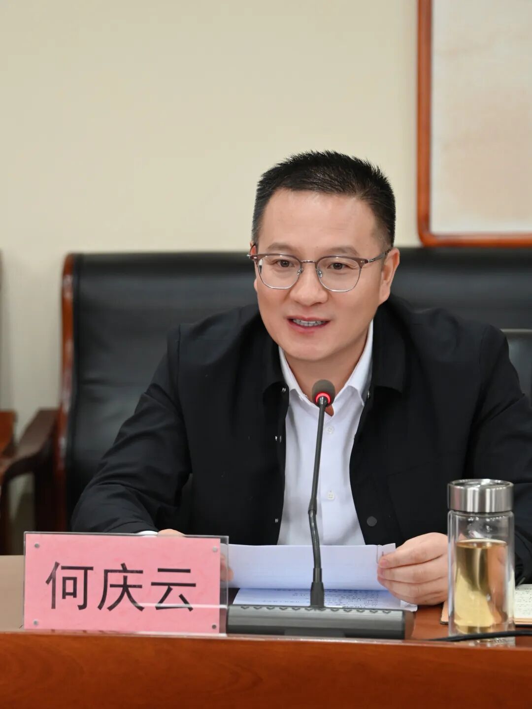 何庆云致欢迎辞,他代表学校对“登峰班”名校长工作室一行的到来致以诚挚欢迎。他表示,“登峰班”名校长工作室汇聚了区域内教育改革的领军者,承载着前沿的办学理念与丰富的实践经验,此次交流指导是对上饶中学办学工作的极大鼓舞,学校期盼以此次交流为契机,深度汲取先进办学智慧,推动上饶中学教育教学工作高质量发展。
