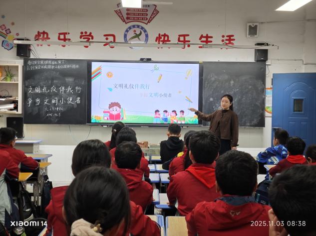 活动伊始,四(六)中队的队员们带来精心编排的主题手势舞,灵动的动作与文明主题相呼应,瞬间点燃现场氛围,正式拉开活动序幕。队会课上,各中队辅导员依托精美的课件,围绕“什么是文明礼”“校园不文明行为”“校园文明规范”“校园礼仪”四大核心板块展开细致讲解。讲解过程中,辅导员们结合学生日常生活中的真实案例,将抽象的礼仪知识转化为具体可感的行为指引,让队员们清晰认识到文明行为的重要性,也明确了日常校园生活中该如何践行文明礼仪,为队员们上了一堂生动且深刻的文明教育课。