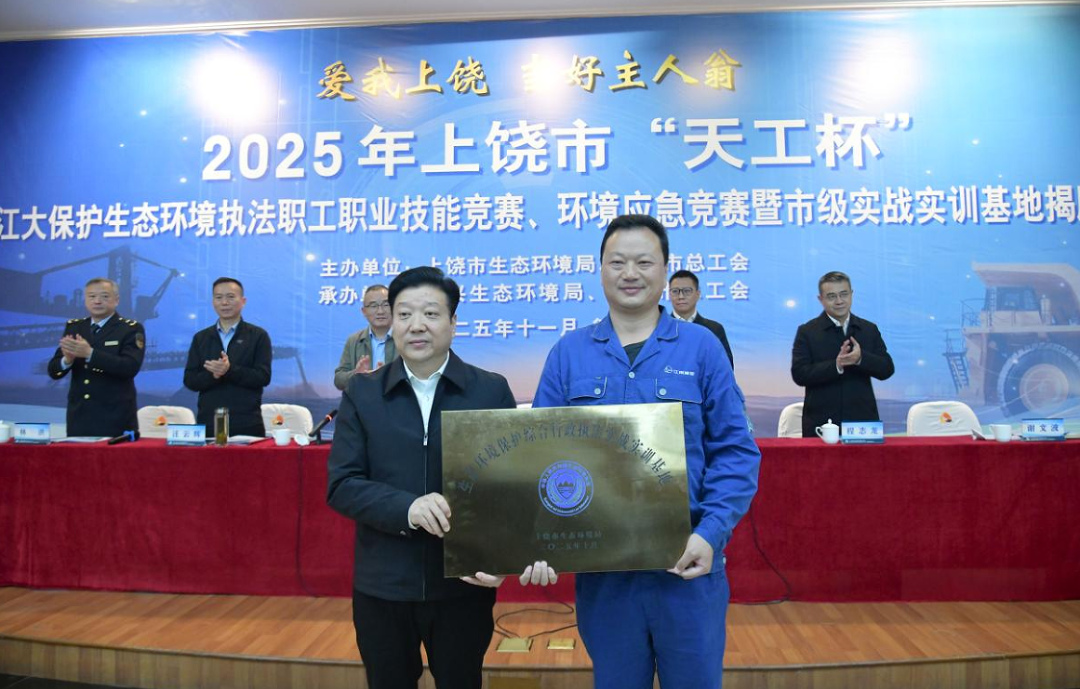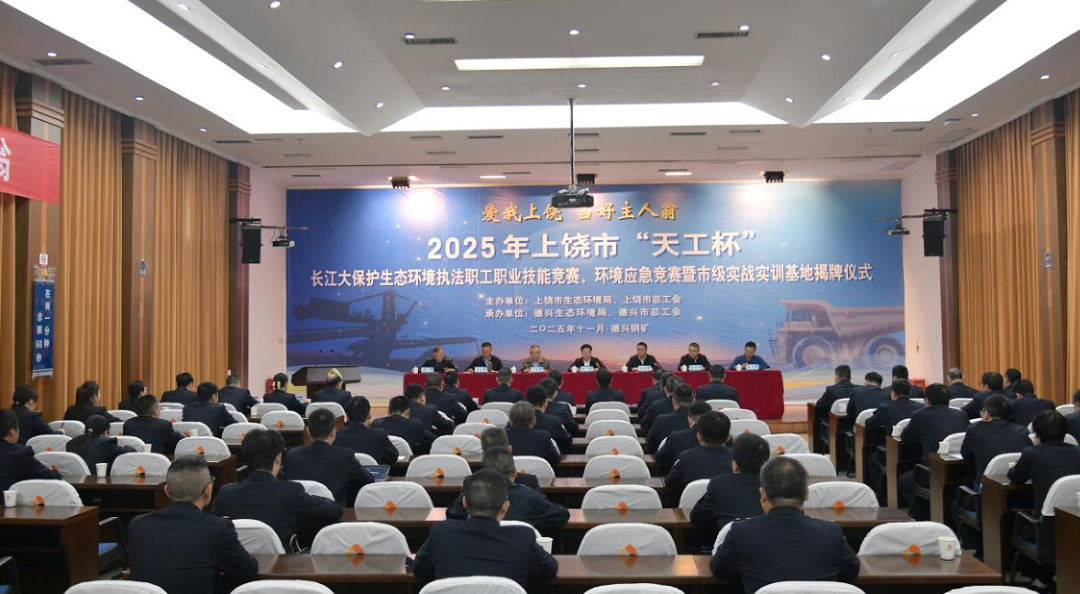 立冬将至,硕果盈枝。在金山银城铜都——美丽的德兴,一场以“天工”之名赴生态之约,以技能为刃护长江安澜的盛会如期而至。11月6日,2025年上饶市“天工杯”长江大保护生态环境执法职工职业技能竞赛、环境应急竞赛开幕式暨市级实战实训基地揭牌仪式在此举行。