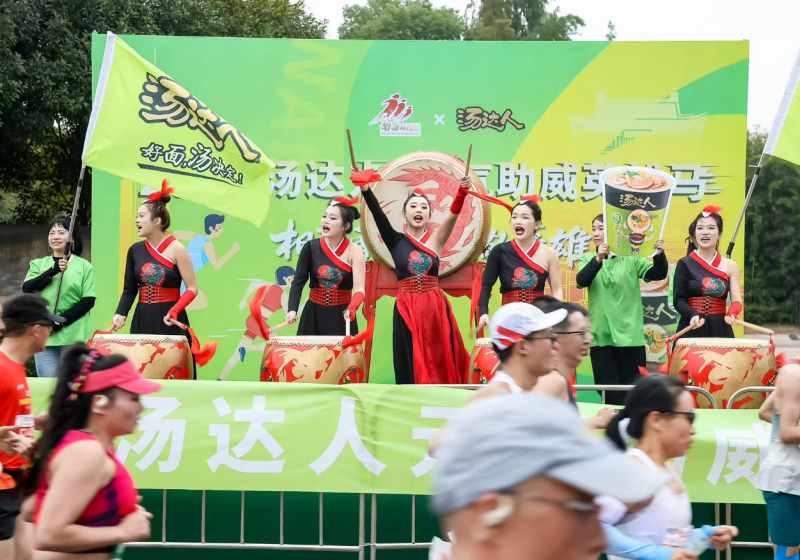 汤达人元气加油站,激昂鼓舞为跑者助威,鼓声与跑者的脚步声共振,驱散奔跑的疲惫。