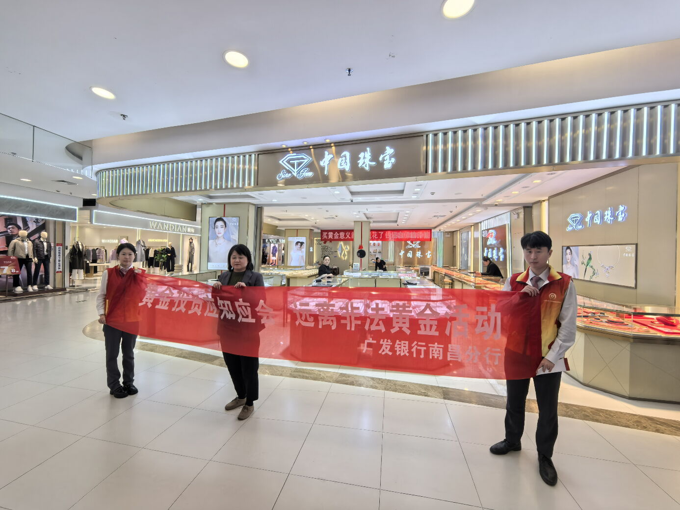 活动期间,广发银行南昌昌南支行积极响应监管及上级分行要求,主动走进“中国珠宝”线下销售门店,向消费者及店员面对面普及黄金投资知识,解答投资者关心的问题,引导其树立正确的投资观念,远离非法黄金活动。