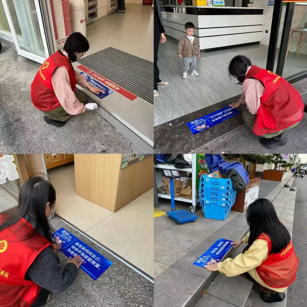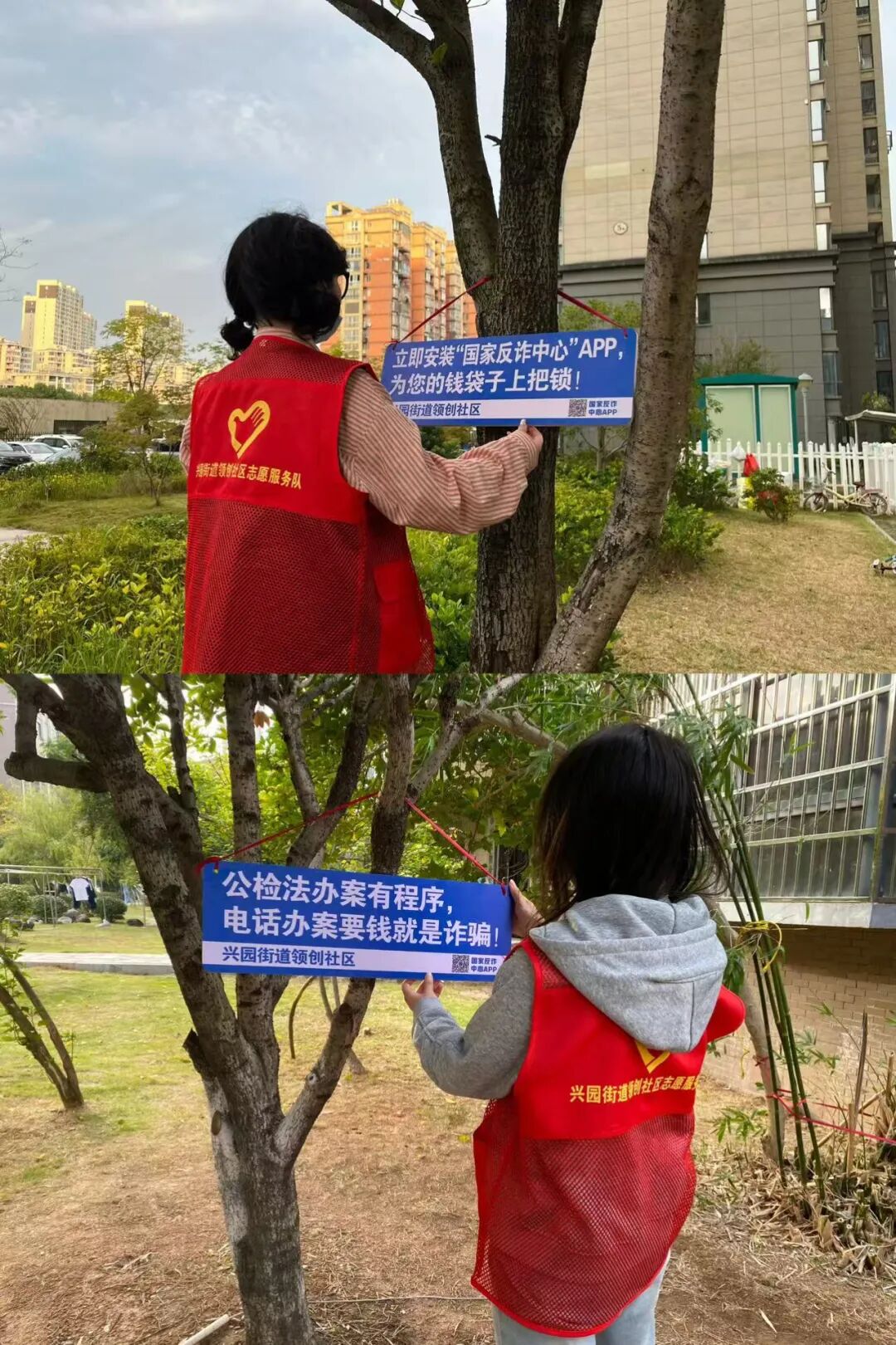 在各单元楼门口,社区干部张贴了色彩鲜明的“反诈小脚印”贴纸,引导居民一步步走进反诈“安全地带”;针对食杂店、快递驿站、酒店等人流量大区域,社区干部在店铺入口地面贴上简洁醒目的反诈贴纸,让居民在购物、取件的间隙,轻松了解反诈知识。另外,还在小区树木悬挂“公检法办案有程序,电话办案要钱就是诈骗”“立即安装‘国家反诈中心’APP,为您的钱袋子上把锁!”等通俗易记的标语,成为小区一道独特的“反诈风景线”。