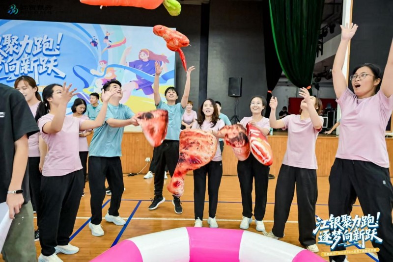 最具趣味性的当属“快乐江银·热辣争锋”,8人团队化身“火锅食材搬运工”,在规定时间内奋力抢夺海鲜、荤菜、素菜等“食材”,不同分值的食材增添了比赛的策略性,大家相互配合、巧妙布局,赛场一片欢腾。“极速种梦·出类拔萃”要求6人齐心在充气萝卜田中快速“拔萝卜”,但错拔异色萝卜会为对手加分,紧张刺激的赛制让大家既拼速度又需保持细心,比赛过程充满了惊喜与挑战。