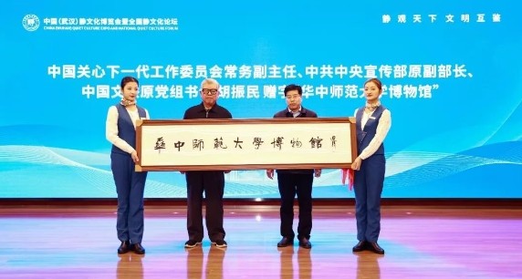 中国关心下一代工作委员会常务副主任、中共中央宣传部原副部长、中国文联原党组书记 胡振民,将《华中师范大学博物馆》题字匾额赠予由华中师范大学党委书记夏立新。