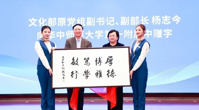随后,第十三届全国人民代表大会教育科学文化卫生委员会副主任委员、文化部原党组副书记、副部长 杨志今,将胡振民部长承载着对青少年成长殷切期望的题字,赠予连续多年全国百强高中名列榜首的华中师范大学第一附属中学校长、党委副书记徐惠。