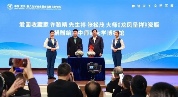 爱国收藏家 许黎晴 先生将其珍藏的中国工艺美术泰斗、“粉彩大王”张松茂 大师创作的《龙凤呈祥》瓷瓶,捐赠予华中师范大学博物馆,由华中师范大学副校长、教育发展基金会理事长刘宏达代表受赠。
