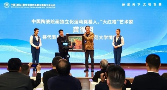 中国陶瓷绘画独立运动奠基人、“大红袍”艺术家 龚循明,将其色彩绚丽、笔意奔放的代表作《己巳秋月》赠予华中师范大学博物馆,由华中师范大学校长彭双阶代表受赠。