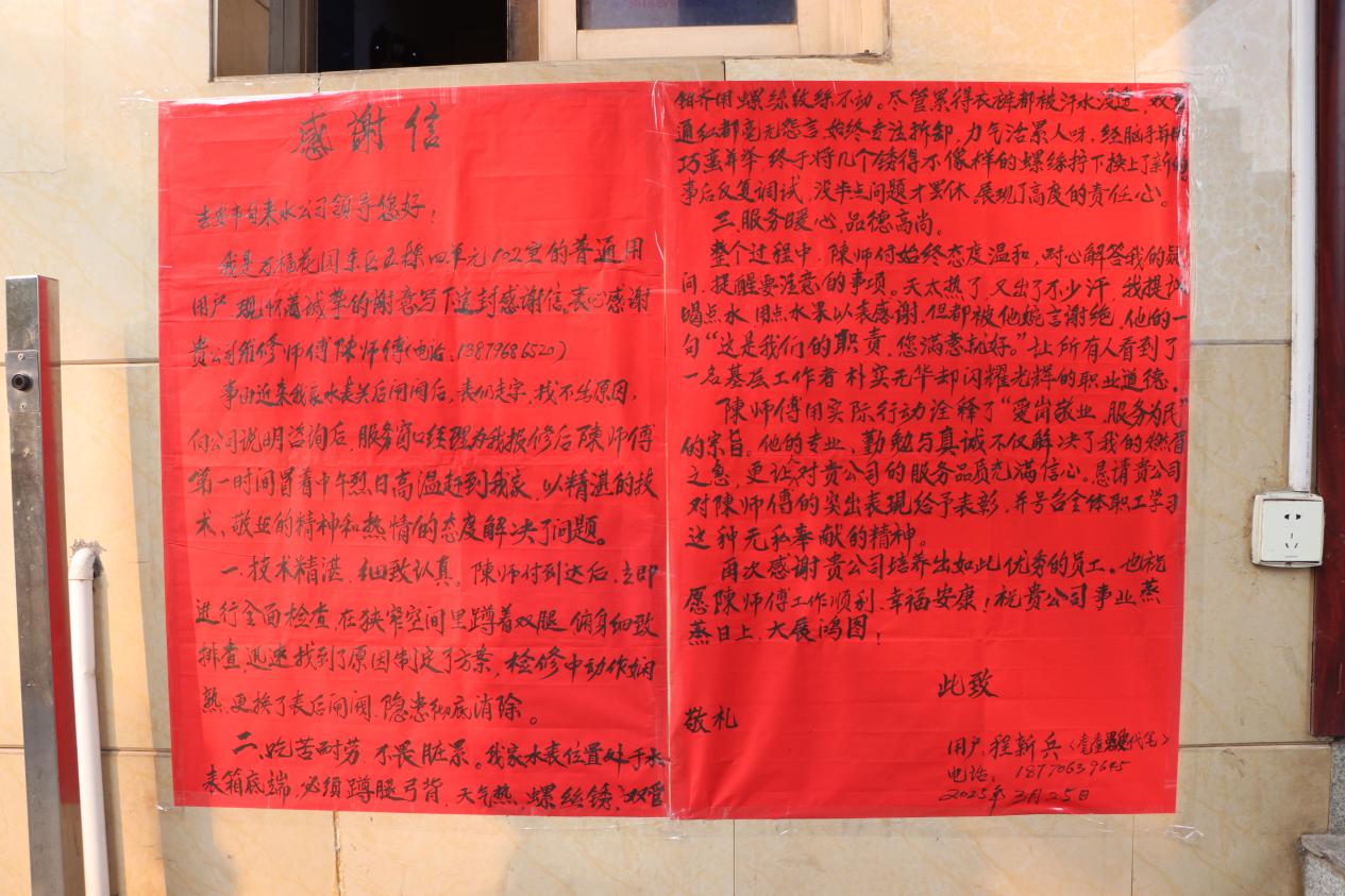 用心的坚守同样温暖,2025年3月,万福花园东区程大爷因空置房屋产生莫名水费求助,维修工秦小勇师傅利用中午空档时间上门,全面排查后免费更换了老旧总闸门,用耐心细致的服务打消耄耋老人的顾虑,老人亲笔写下感谢信致敬吉安水务的担当。