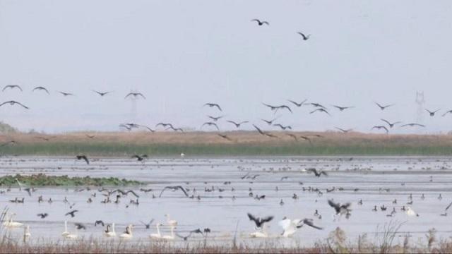 南矶湿地是东亚-澳大利西亚候鸟迁飞线路上的重要节点,湿地内众多碟形湖是白鹤、东方白鹳等众多濒危候鸟的重要越冬地。每年有包括白鹤、天鹅、大雁等20多万只候鸟到这里越冬栖息。