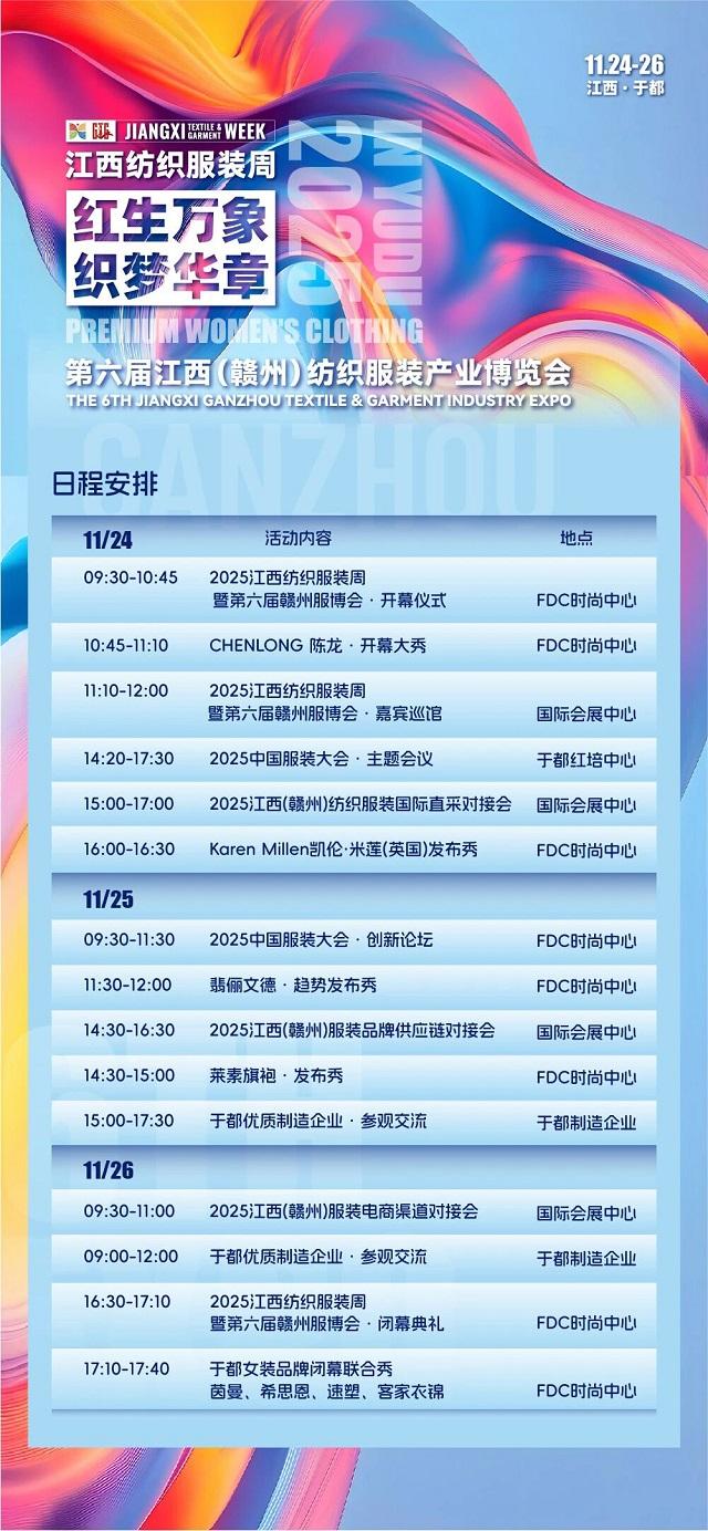 动态活动内容丰富、亮点纷呈。除开幕式和颁奖盛典外,将举办6场主要活动:“2025中国服装大会”汇聚全国服装行业精英,带来权威的行业趋势分享与预测,助力企业把握发展机遇;“江西纺织服装原创设计”五场大秀,深度融合长征文化与时尚文化,展现赣产服装的设计实力和文化内涵,为原创设计人才提供展示舞台;“中国服装品牌供应链资源对接会”“服饰电商渠道推介会”等商贸对接活动,搭建本土企业与国内外采购商、电商平台的高效对接桥梁,促进供需精准匹配、合作共赢。