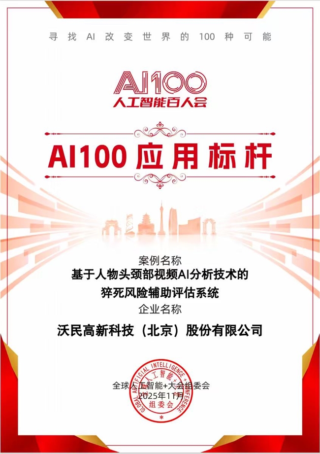 近日,寻找AI改变世界的100种可能——“AI100应用标杆榜”名单公布,沃民高科报送的“基于人物头颈部视频AI分析技术的猝死风险辅助评估系统”荣登榜单。
