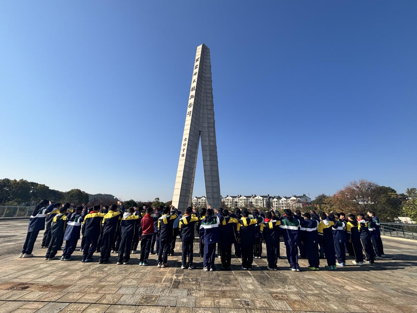 随后,大家来到纪念碑广场。19.38米高的纪念碑巍然矗立,底座英烈名单醒目。大家列队整齐,昂首肃立、集体敬礼,以庄重的仪式表达对抗战英烈的深切缅怀与崇高敬意。