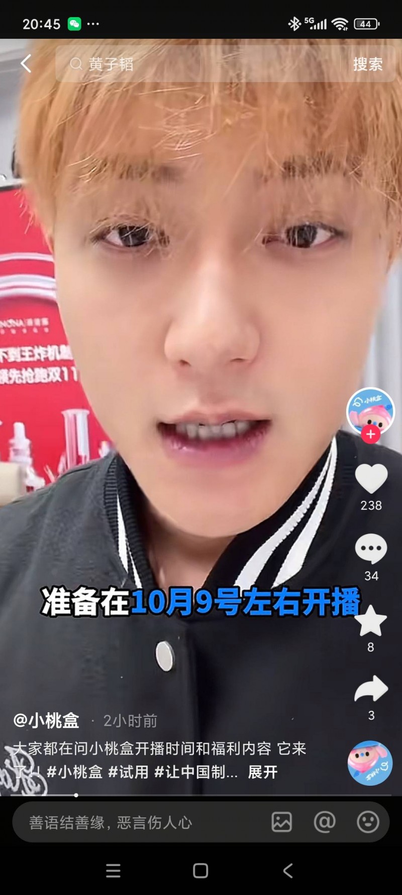 在直播中,黄子韬表示,小桃盒于 10 月 9 日正式开播,每晚 7点与用户见面。消费者期待能有更多博士加入,带来更专业、更多的产品解读,同时希望账号能够持续深化“用户共创”,从选品到体验,让用户的需求成为产品的核心驱动。