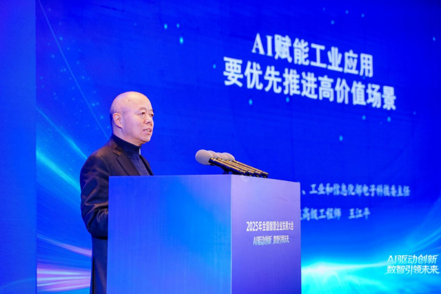 第十四届全国政协委员、工业和信息化部电子科技委主任、研究员级高级工程师王江平作题为《AI赋能工业应用要优先推进高价值场景》的主题演讲