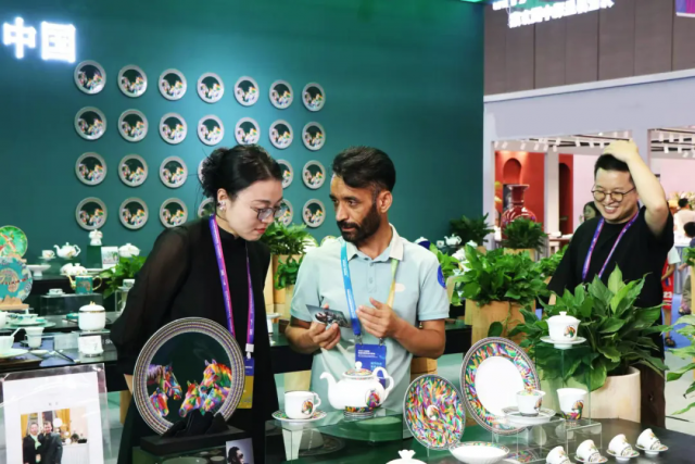 2025中国景德镇国际陶瓷博览会上,“瓷都礼物”品牌工作人员向国外客户介绍产品。朱俊峰摄