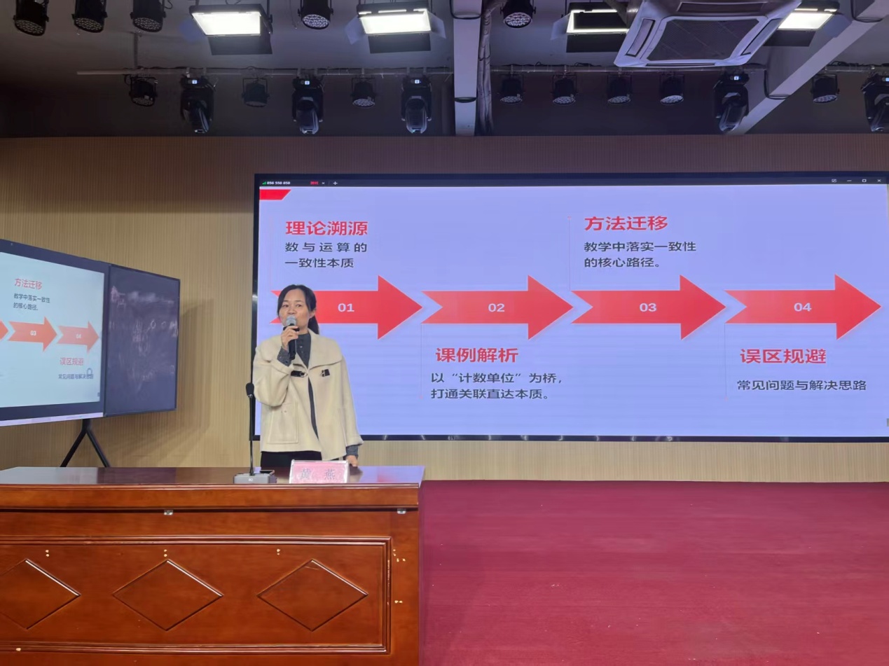 随后,黄老师进行《打通关联直达本质——例谈一致性视角下数与运算教学实践》讲座。她深入剖析了数与运算之间的内在联系,强调在教学中要把握知识的一致性,引导学生从整体上构建知识体系。黄老师的讲解深入浅出,既有理论的高度,又有实践的指导,让在场的老师们受益匪浅。