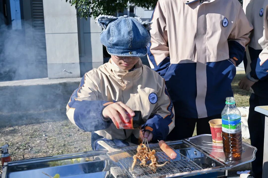 当日上午10点30分,校园美食一条街率先热闹起来。从食材挑选、精细处理到创意烹调,每一个环节都由高一学生自主完成。同学们摇身一变,成为活力满满的“摊主”与“大厨”:有的忙着翻动烤架上滋滋冒油的肉串、香肠,有的专注制作软糯香甜的麻滋粿、金黄酥脆的蛋挞,还有的精心调配奶茶、果汁等饮品,各色美食琳琅满目,香气弥漫校园。