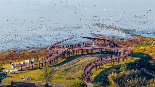 驱车穿过芦荻摇曳的最美水上公路,来到吴城候鸟小镇狮子山观鸟点。近岸的湖面上,成群的小天鹅、大雁等候鸟在此游弋嬉戏,与不远处万鸟翩跹、振翅翱翔的鸟浪,构成一幅幅灵动的生态画卷,吸引众多游客近距离观赏打卡。大家纷纷通过手机相机镜头,定格候鸟倩影,记录美好瞬间。