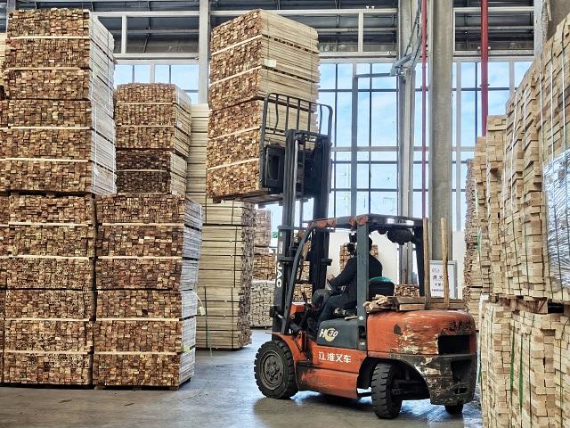 赣州市林友木业制品有限公司内,叉车驾驶员熟练地装卸、搬运和堆码木材