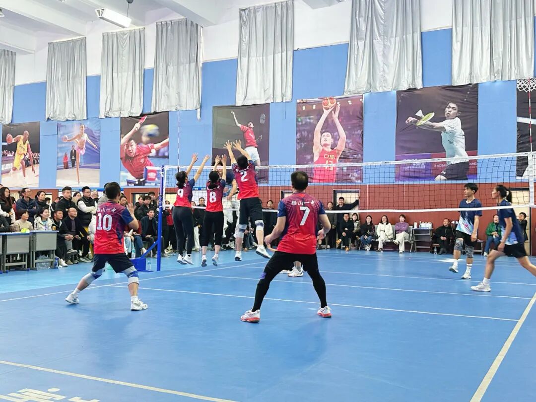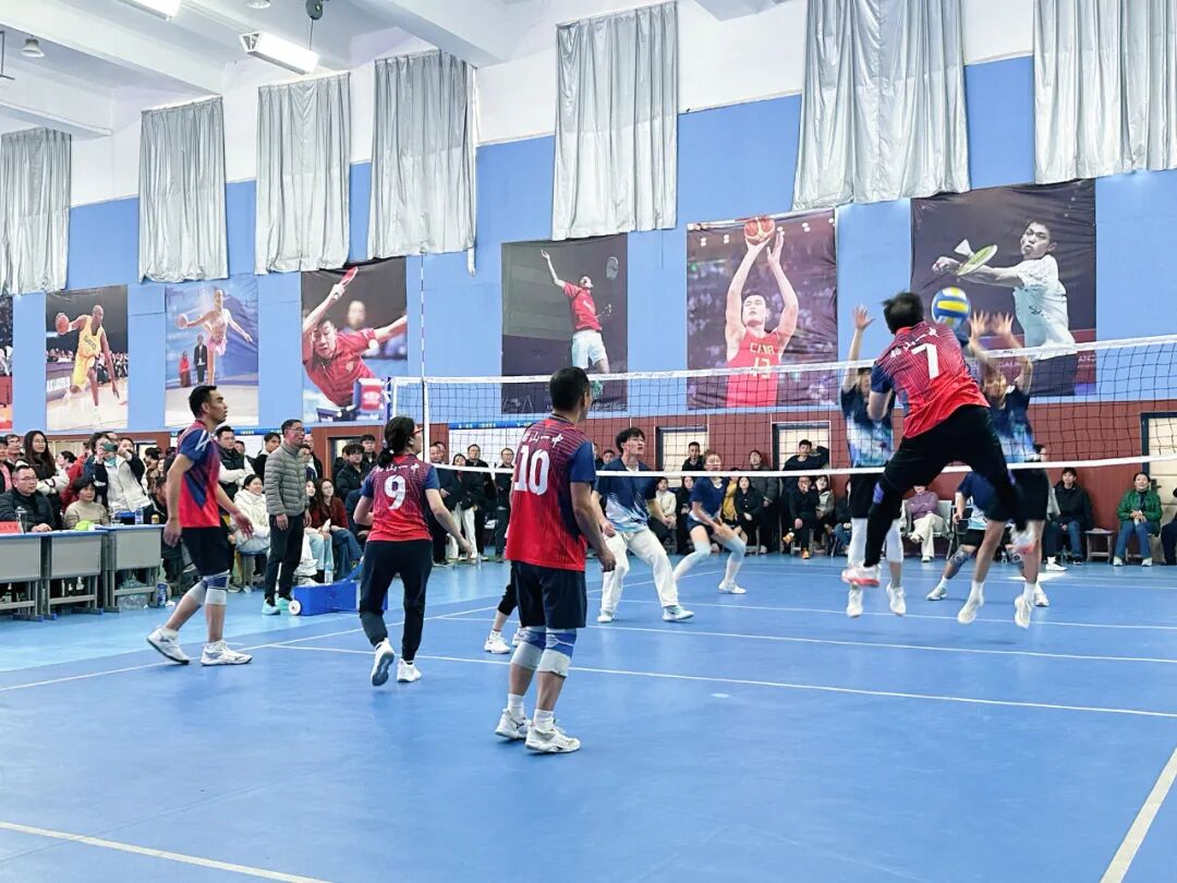 本场决赛对阵作风顽强、实力不俗的致远中学队。比赛中,一中教师们斗志昂扬,每球必争:防守时飞身救球不放弃,进攻时凌厉扣杀显锋芒。主力主攻、2号黄磊老师眼疾手快,屡次捕捉对方防守空隙,跃起重扣得分;7号戴庆山老师作为第二主攻点,与黄磊默契联动,双线施压、轮番强攻,持续突破对方防线。