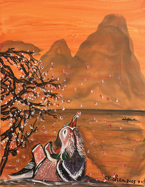 对于“失爱”情景,陈持平并未选择撕心裂肺的悲剧式表达,而是以写意手法勾勒其中孤寂与释然并存的复杂心境。在作品《泪眼问花花不语》中,一只鸳鸯独立水畔,凝望天空,身旁落花纷飞如语却终归无声。画面意境空旷苍茫,承载无限失爱的惆怅,却以情景交融的笔触达成“哀而不伤,寂而不灭”的境界。即便是一个悲剧,也是最好的美学悲伤。作品《再回首,我心依旧》则表现出失爱后的释然与坚守。画面无泪无言却深情涌动,这种节制优雅的失爱表达最是牵动人心。陈持平不仅是技艺高超的丙烯画家,更是深谙人性的心理美学家。