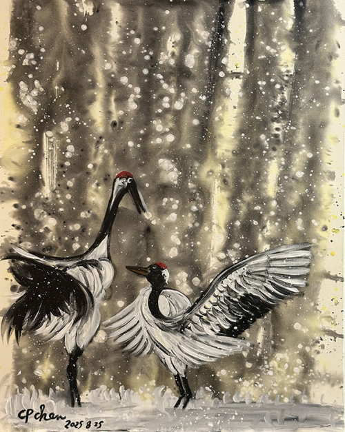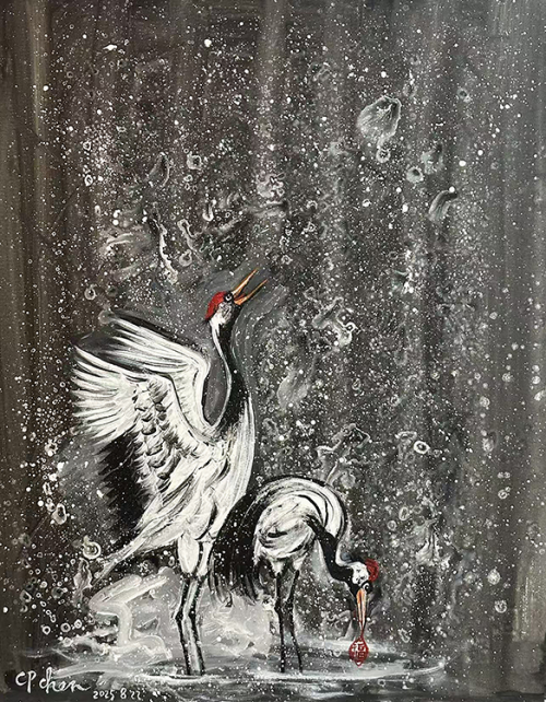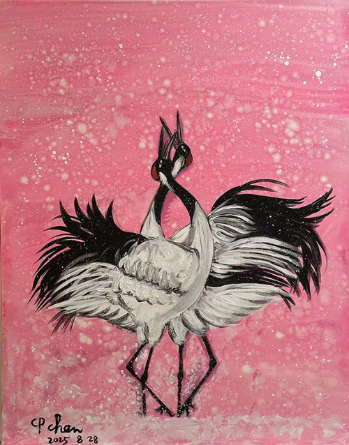在作品《永结同心》中,陈持平采用写实手法描绘双鹤绕颈相依的场景。桃粉色的背景朦胧温暖,烘托出彼此依恋、你侬我侬的温情。丙烯材料的多元表现力在此尽显:既能细腻呈现水的流动质感,亦能精准塑造羽毛的柔润与光影的柔和。双鹤的姿态与色彩结构,成就了视觉化的“梁祝协奏曲”,和谐而庄重地歌颂爱情,让观者沉醉于爱的美好旋律之中,流连忘返。
