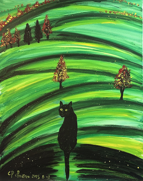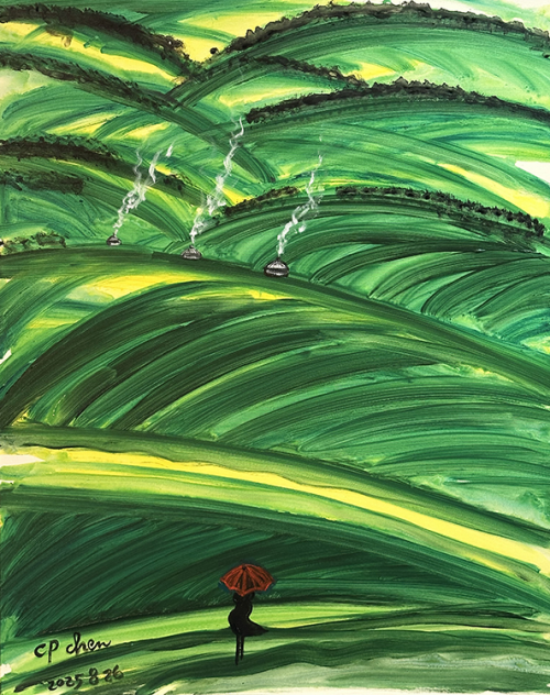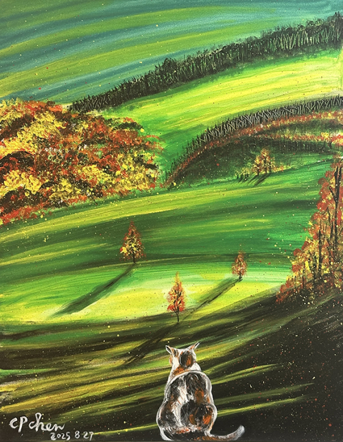爱的分别与等待,是“爱系列”中极为动人的章节。陈持平敏锐地捕捉到待爱归来的心理细节,并以多样手法加以呈现。《我在盼望中等待你》采用写实技法,塑造出一位身着红衣黛裙的年轻女子独立旷野的形象:她手持风伞,遥望绿野层原,远处炊烟袅袅,既勾勒出家的温暖,更暗喻等待的漫长。这一场景可解读为初嫁女子盼郎归的殷切与忐忑。画面色彩明丽却情绪含蓄,宛如一首凝练动人的抒情诗,道尽言语难表的待爱之思。而在作品《我在未来中等待你》中,画家转而采用拟人与象征手法,以一只孤猫望向青山绿水的背影,传递等待中的孤独与坚守。猫虽无言,山河浩渺,但姿态中透出坚定的信念,暗示爱虽未至却终将归来。这种寄喻式的表达,突破具象限制,为“待爱”主题注入浓厚的哲学意味。